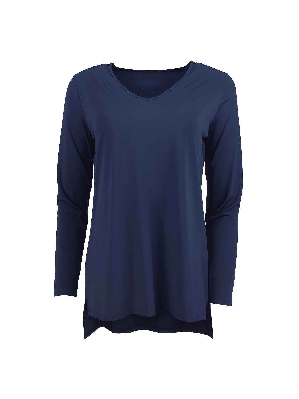 First of all, this piece was “designed” by our Stylists who zeroed in on the key details their clients love: a face-flattering V-neck, “push-up” sleeves (takes 5 pounds off of your hips — NO DIETING!), and a cool HiLo hemline that can be tied, French-tucked, or worn loose and lovely.