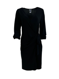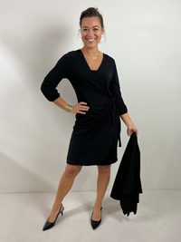 WRAP IT UP! What's better than a figure-flattering Wrap Dress? One that has POCKETS...and a "faux wrap" finish that will never over expose you! We love this classic style for it's versatile gymnastics...she can go from work to cocktails in hot "change-your-footwear" minute! SO Capsule Wardrobe friendly! High neck to hemline: 41".