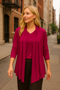 A beloved layer that can be worn SO many ways. I carry one in my tote at all times, all seasons: it’s a fashionable jacket when I need one, a fun and fitted wrap top, and a great airplane blanket when the cabin gets cold.