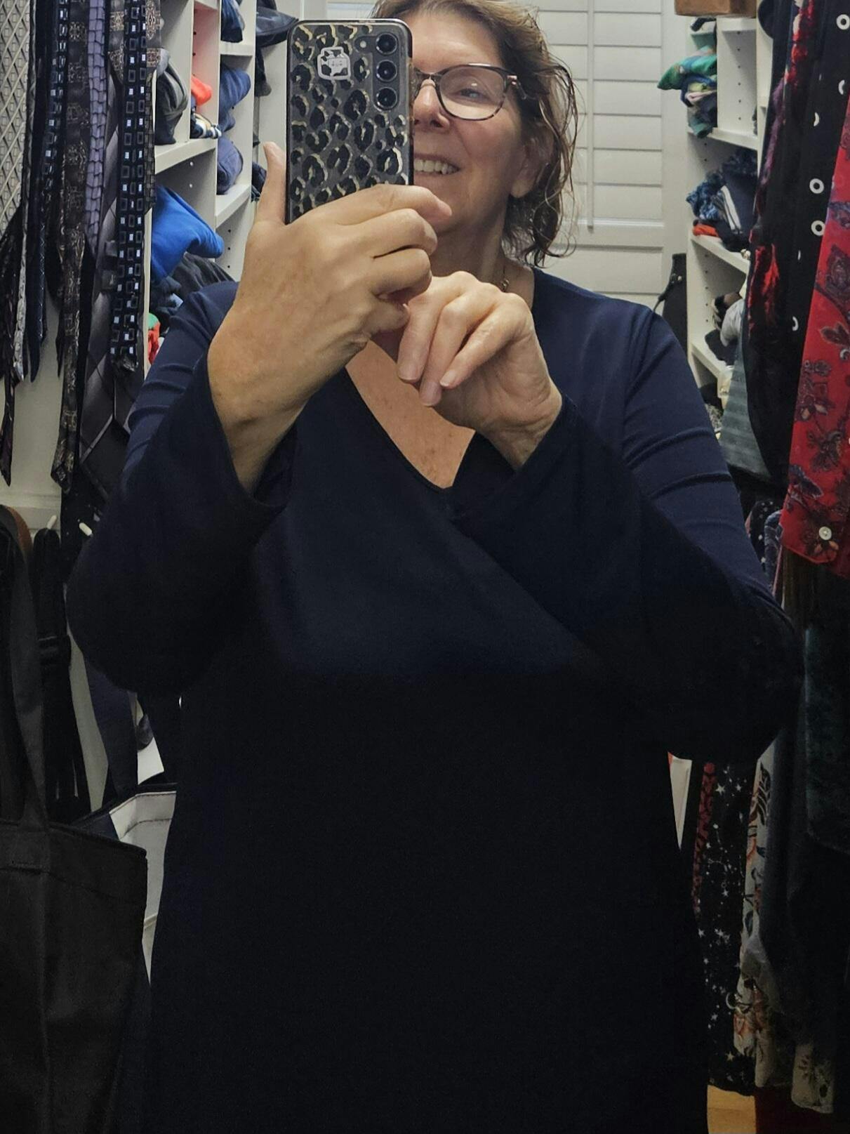 First of all, this piece was “designed” by our Stylists who zeroed in on the key details their clients love: a face-flattering V-neck, “push-up” sleeves (takes 5 pounds off of your hips — NO DIETING!), and a cool HiLo hemline that can be tied, French-tucked, or worn loose and lovely.